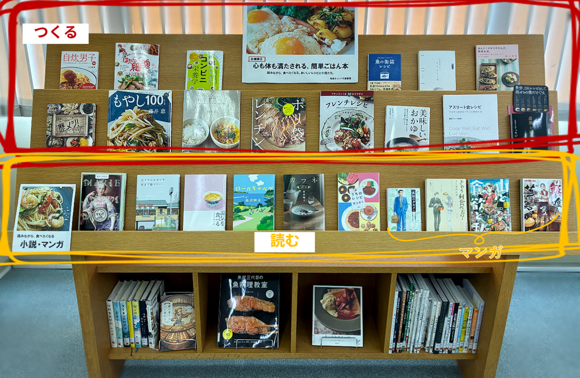 「読む」では、食を通して人のつながりや温もりを描く小説やエッセー、マンガを展示しています。
