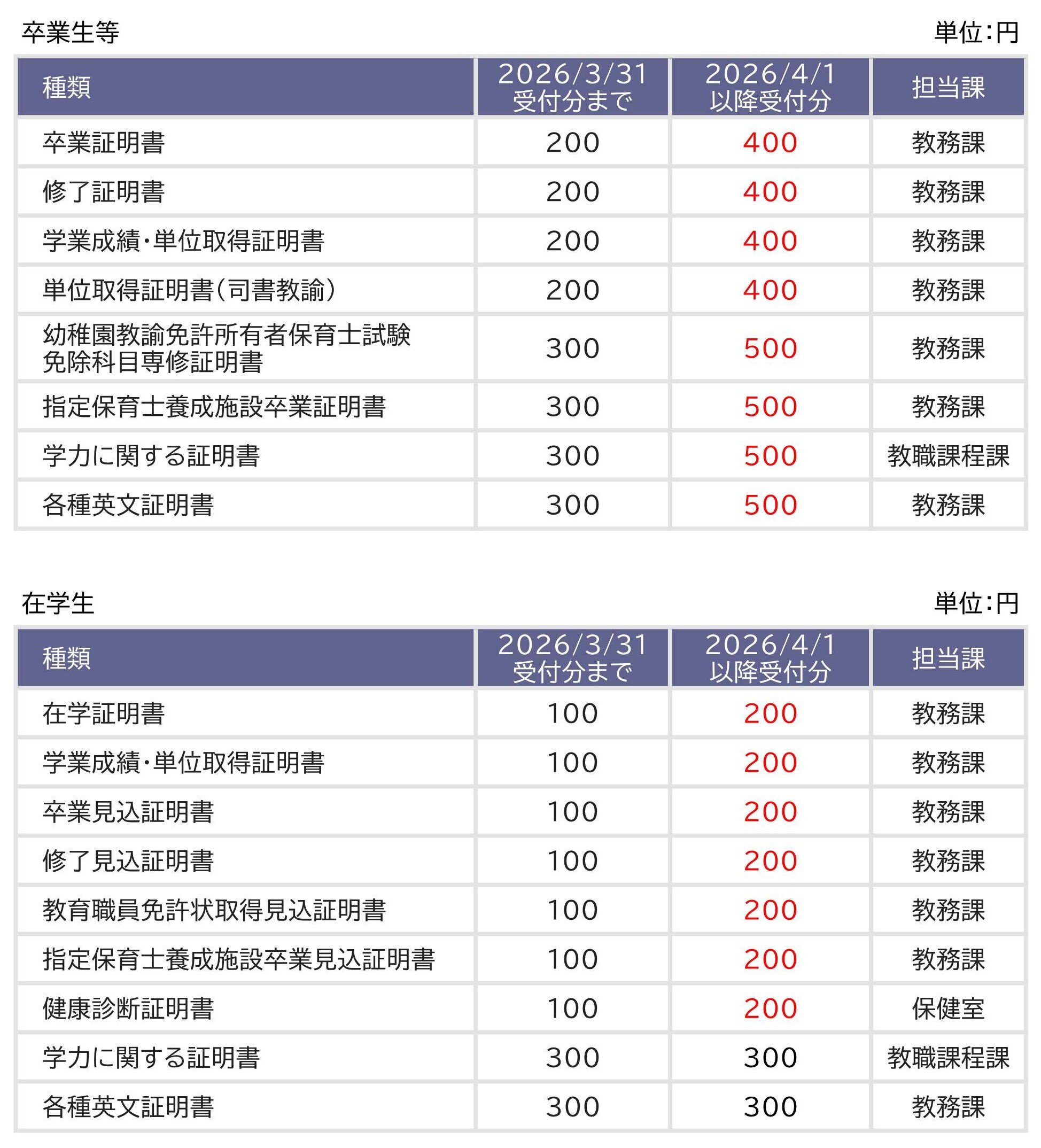 システム維持管理費の高騰やサービス向上のため、2026年4月1日受付分より証明書発行手数料を改定することになりました。証明書の発行方法については証明書発行に関するページをご覧ください。