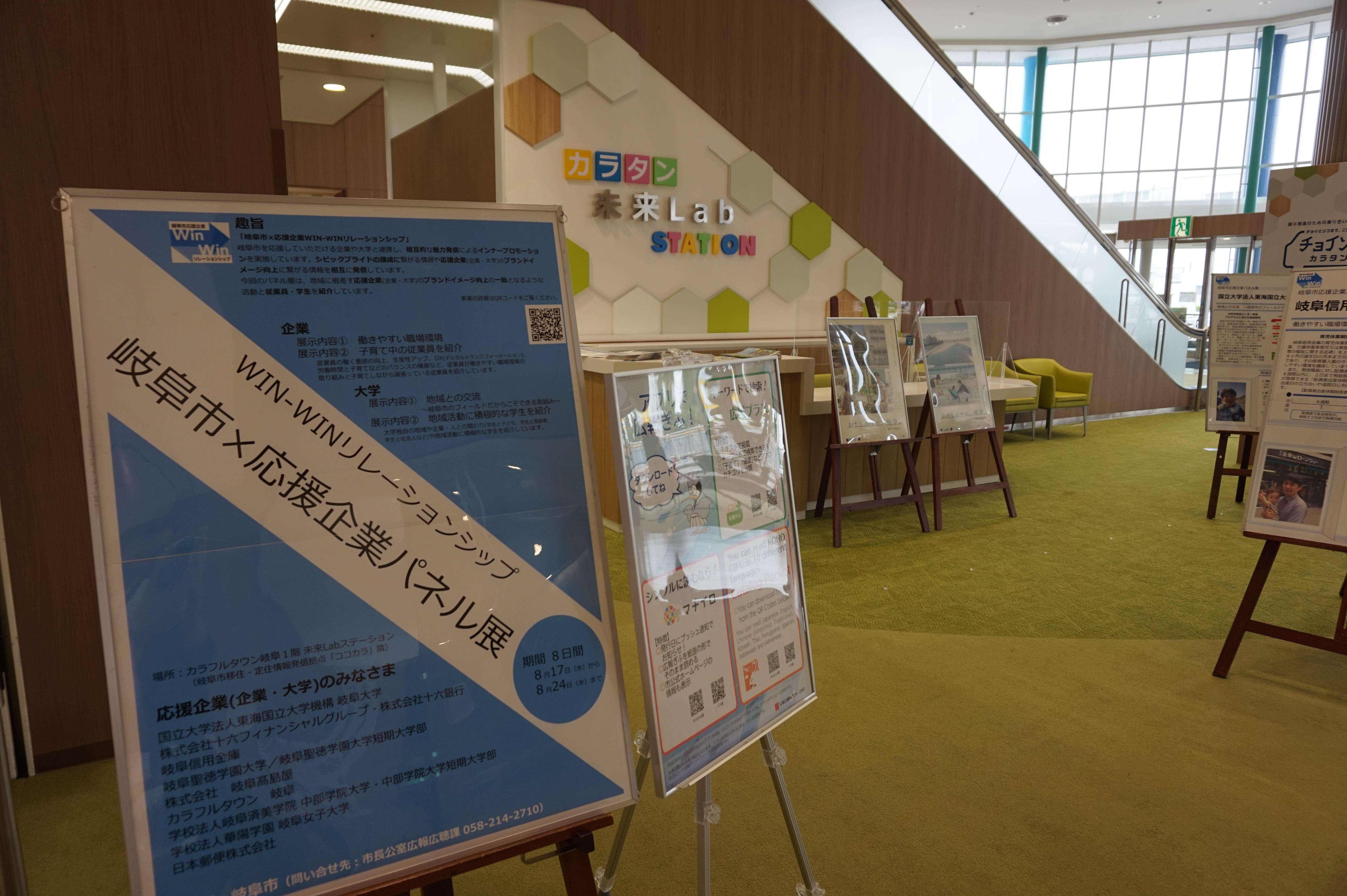 2022(令和4)年8月17日(水)~8月24日(水)の期間内において、カラフルタウン岐阜1階「未来Labステーション」を会場として、岐阜市及び同市と包括連携協定を締結する応援企業間の相互的な魅力発信事業(WIN-WINリレーションシップ)に基づく「パネル展」が催され、本学(岐阜聖徳学園大学/岐阜聖徳学園大学短期大学部)のパネルも展示されています。