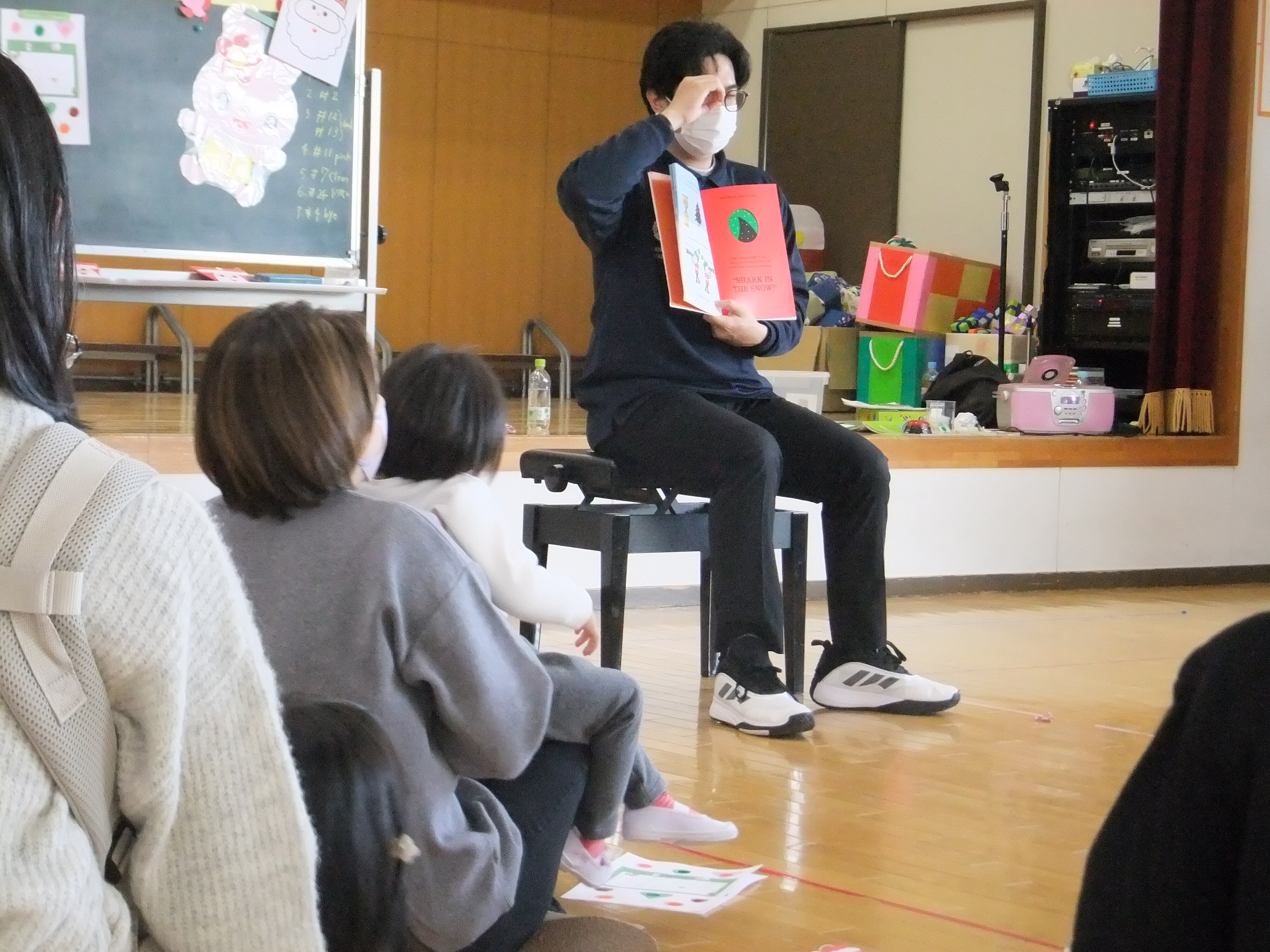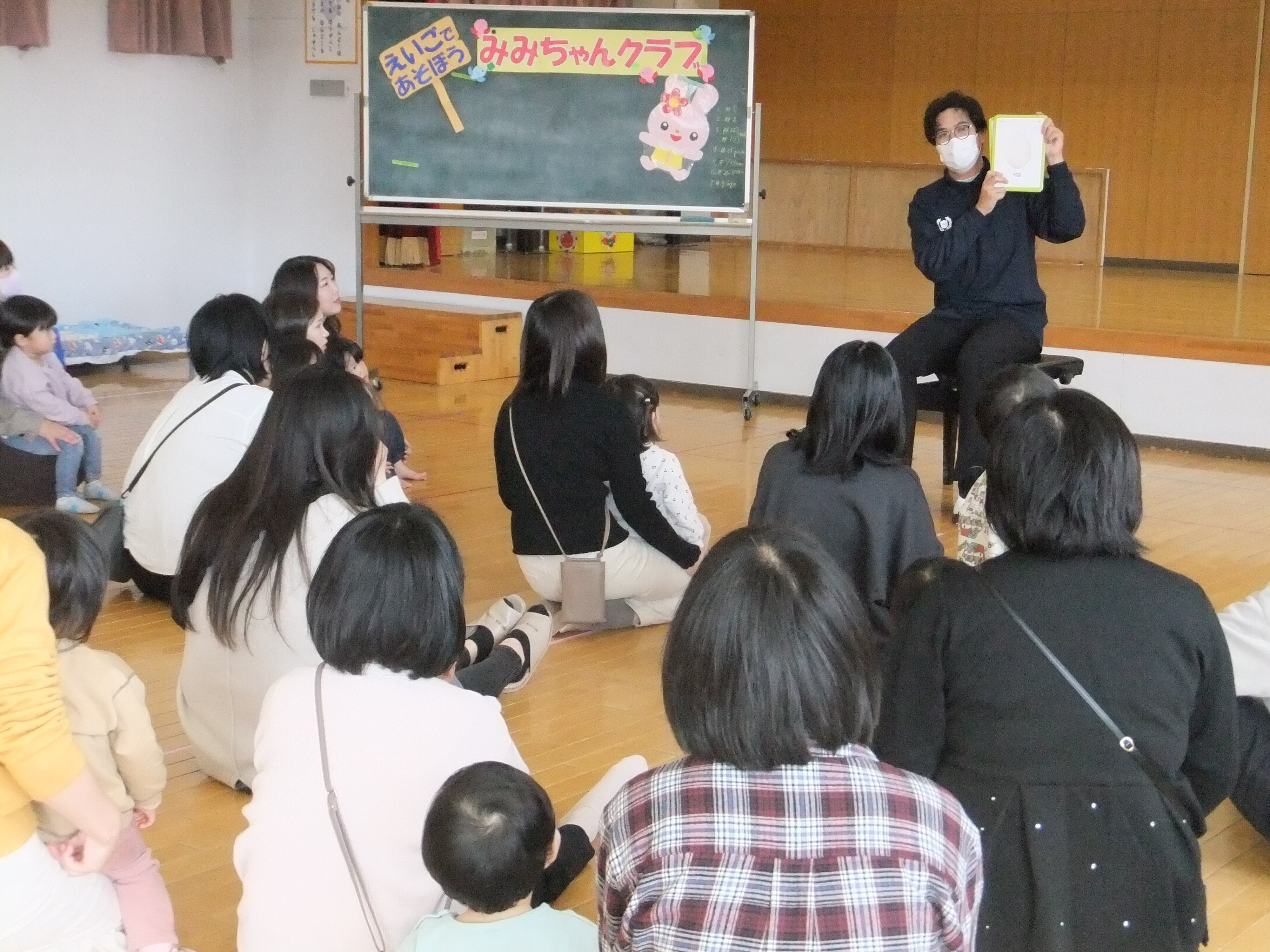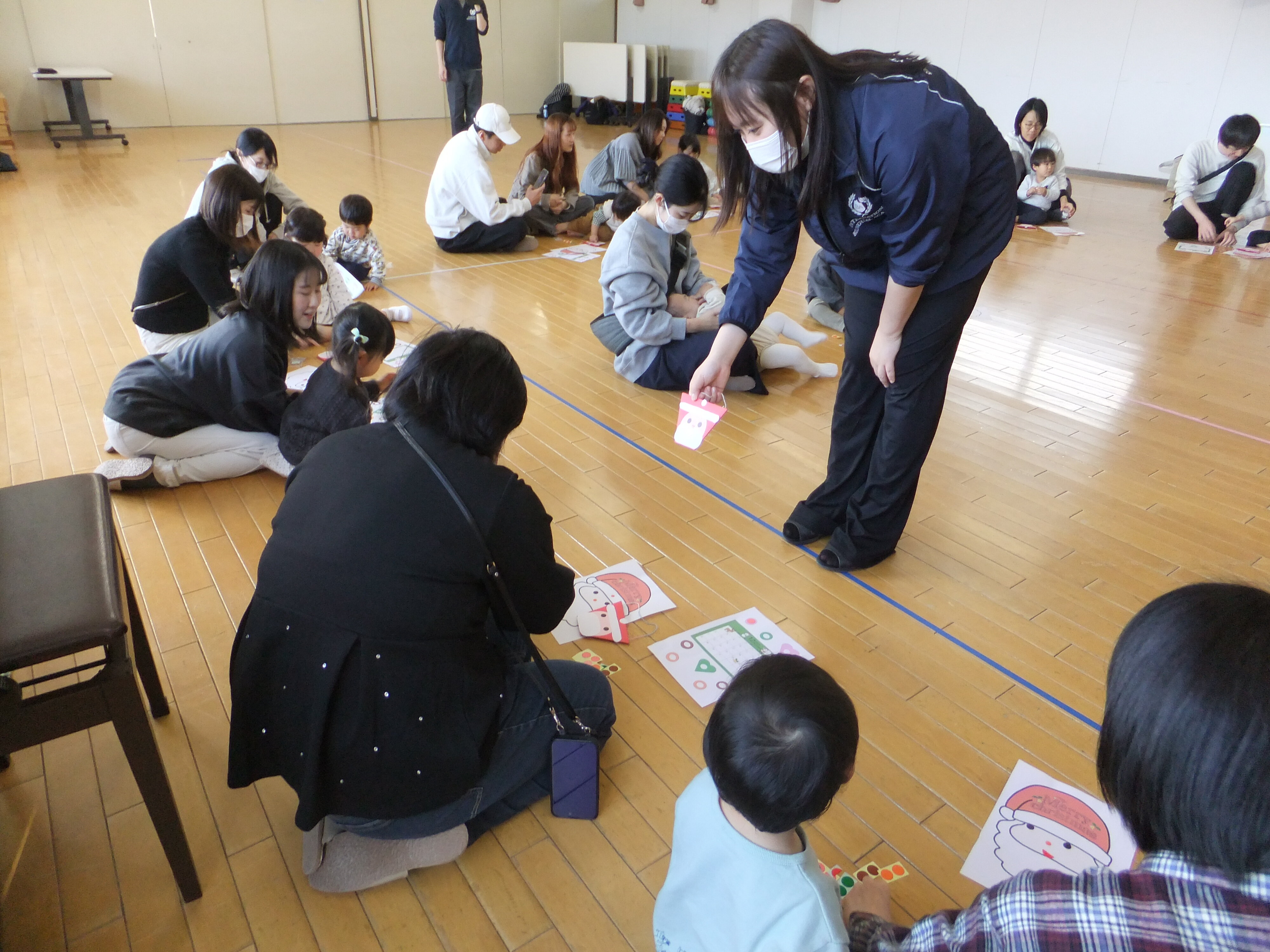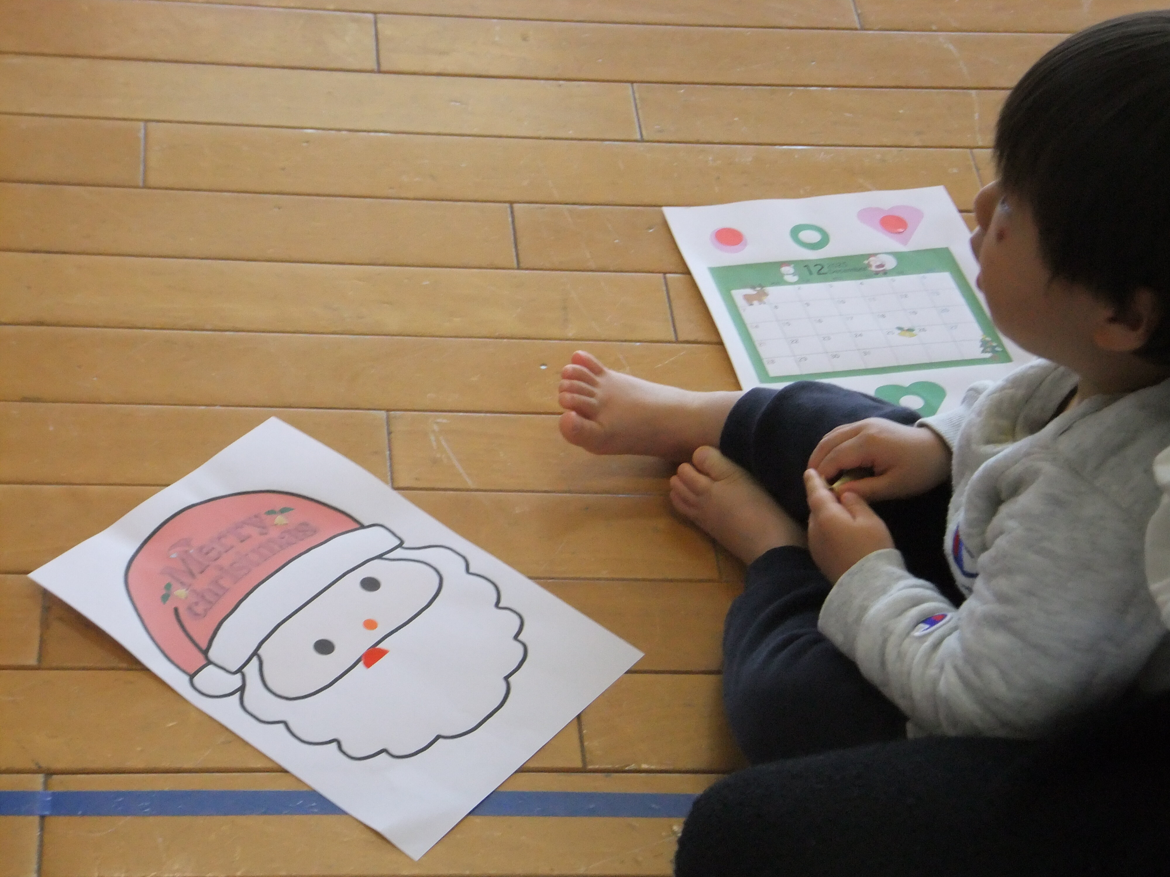 今回の英語であそぼうでは、はじめに大きな輪になって親子でリズム遊びをしたり、カードを見ながら発音の練習をしました。お母さん方もお子さんと一緒に大きな声で発音を楽しんでいただきました。続いてクリスマスにちなんでカラーのシールを貼りながら、かわいい表情のサンタさんを完成させました。絵本の読み聞かせでは、英語のお話をみんな最後まで上手に聞くことができました。