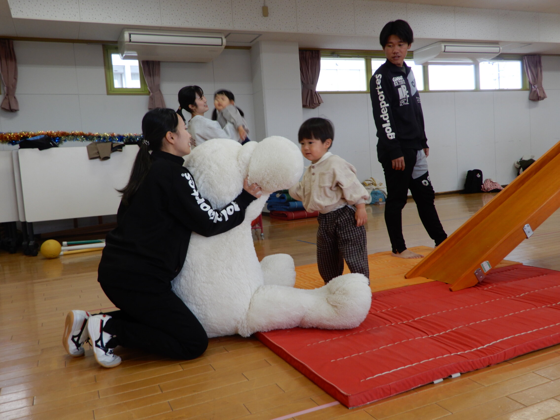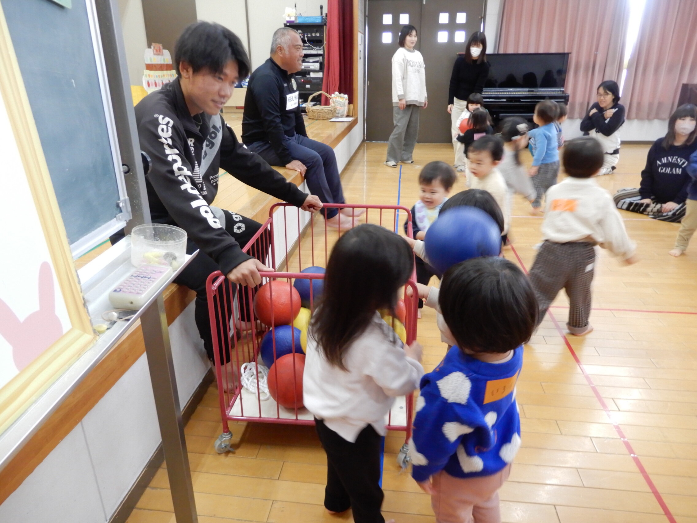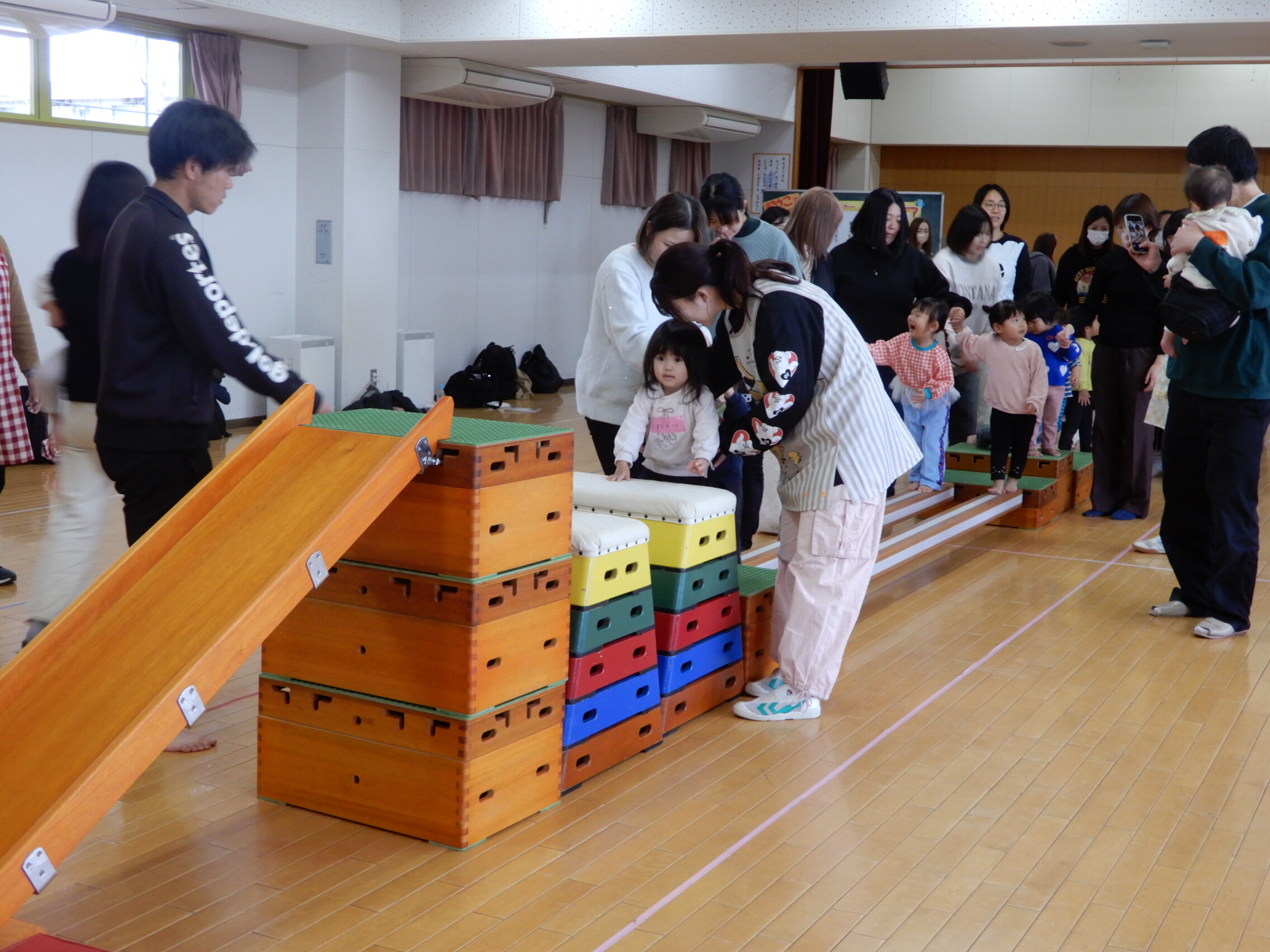 今回のみみちゃんクラブは、体操教室の先生に来ていただき、いろんな運動遊びを楽しみました。跳び箱やマット、滑り台、トンネルなどを並べてのサーキット遊びは、順に並んで挑戦する姿が見られました。繰り返し行うことで、やり方や楽しみ方を覚えて''もっとやりたい''様子の子もいました。 1月9日のみみちゃんクラブは、鬼をやっつけろ!をテーマに鬼のお面作りや、鬼ごっこ、的あてなどもやりたいと考えています。多くの親子さんの参加をお待ちしています。