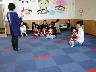 ☆今回のかわいいエピソード・・・☆ Cコースが今回で最後ということやもうすぐ12月ということもありママたちが、「今日はこの姿で参加しよう」と話しあってきてくれたようで、なんとベビーサンタクロースが4人登場の親子教室でした。それぞれ違ったサンタさんの衣装でとってもかわいかったですよ☆